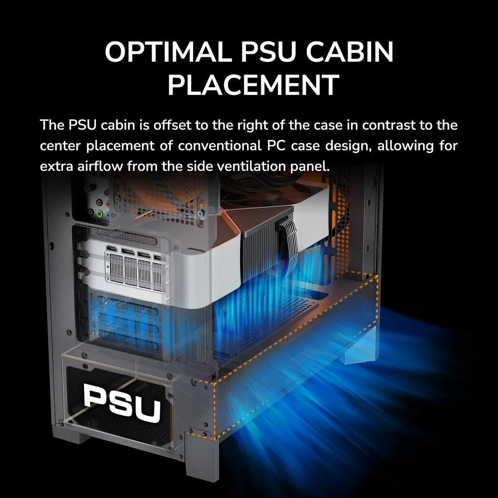 - Le décalage du compartiment du bloc d'alimentation vers la droite maximise l'espace de circulation d'air.