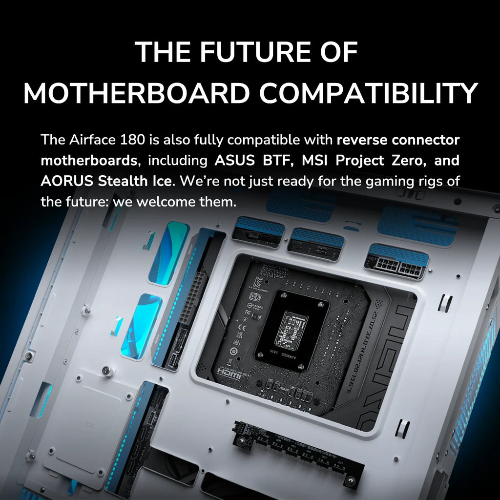 L'Airface 180 est également entièrement compatible avec les cartes mères à connecteurs inversés, notamment ASUS BTF, MSI Project Zero et GIGABYTE Project Stealth. Nous ne nous contentons pas d'être prêts pour les configurations de jeu du futur : nous les accueillons avec enthousiasme.
