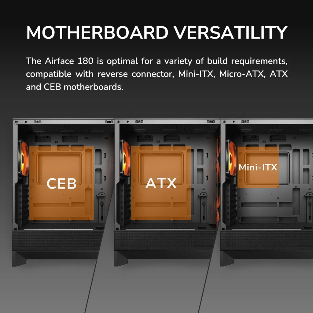 L'Airface 180 est optimale pour une variété d'exigences de construction, compatible avec les cartes mères à connecteur inversé, Mini-ITX, Micro-ATX, ATX et CEB.