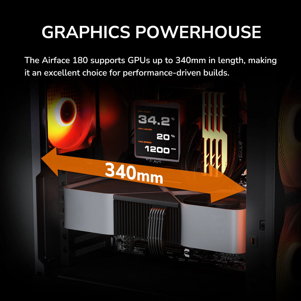 La carte mère Airface 180 prend en charge les cartes graphiques jusqu'à 340 mm de longueur, ce qui en fait un excellent choix pour les configurations axées sur la performance.