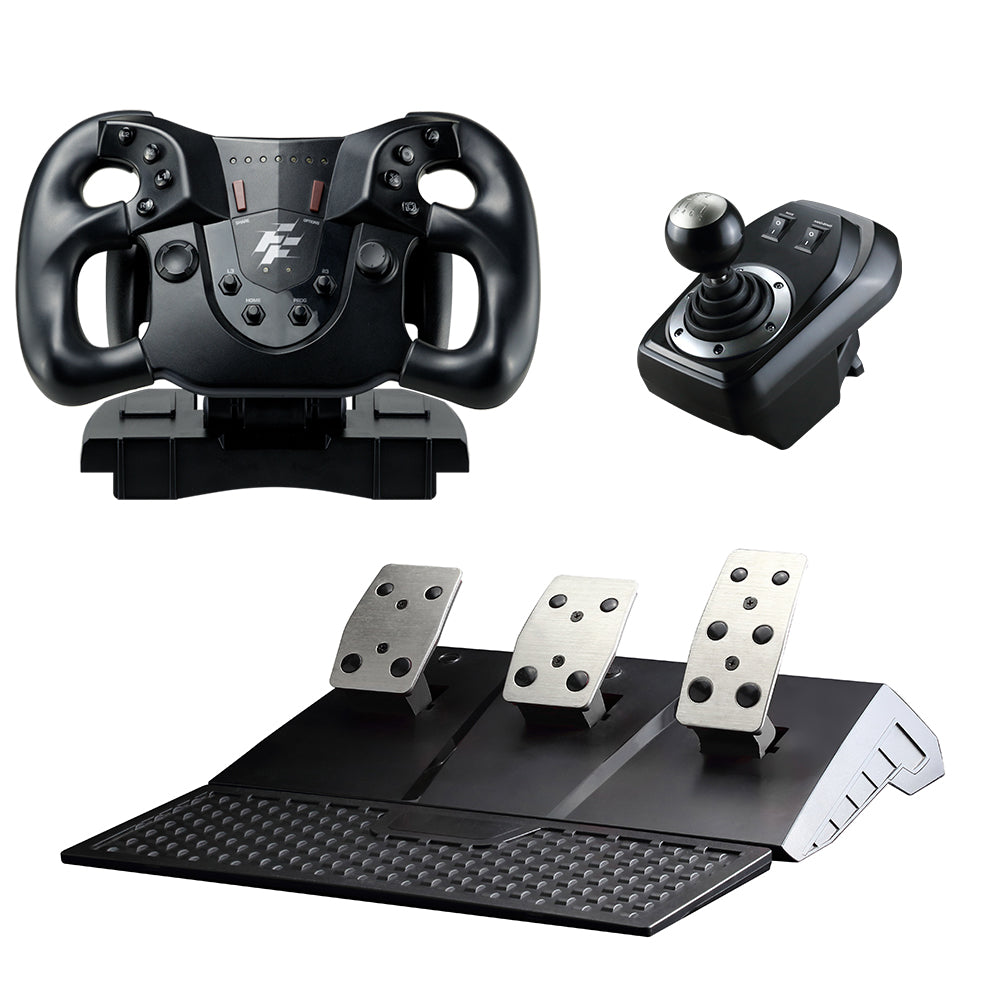 Satisfy your need for speed with the 6-in-1 ES900A. This complete racing set includes a feedback vibration steering wheel, gear shifter paddles, and a pedal floorboard.