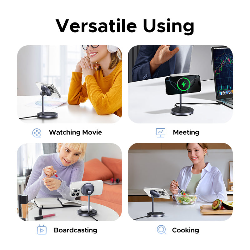 Un support de chargement sans fil compact doté d'un chargeur 15 W compatible MagSafe , d'un socle sans fil 5 W pour AirPods et d'une sortie USB-C 5 W supplémentaire pour les accessoires comme un chargeur Apple Watch, conçu pour alimenter vos appareils essentiels du quotidien à partir d'une configuration propre et organisée.