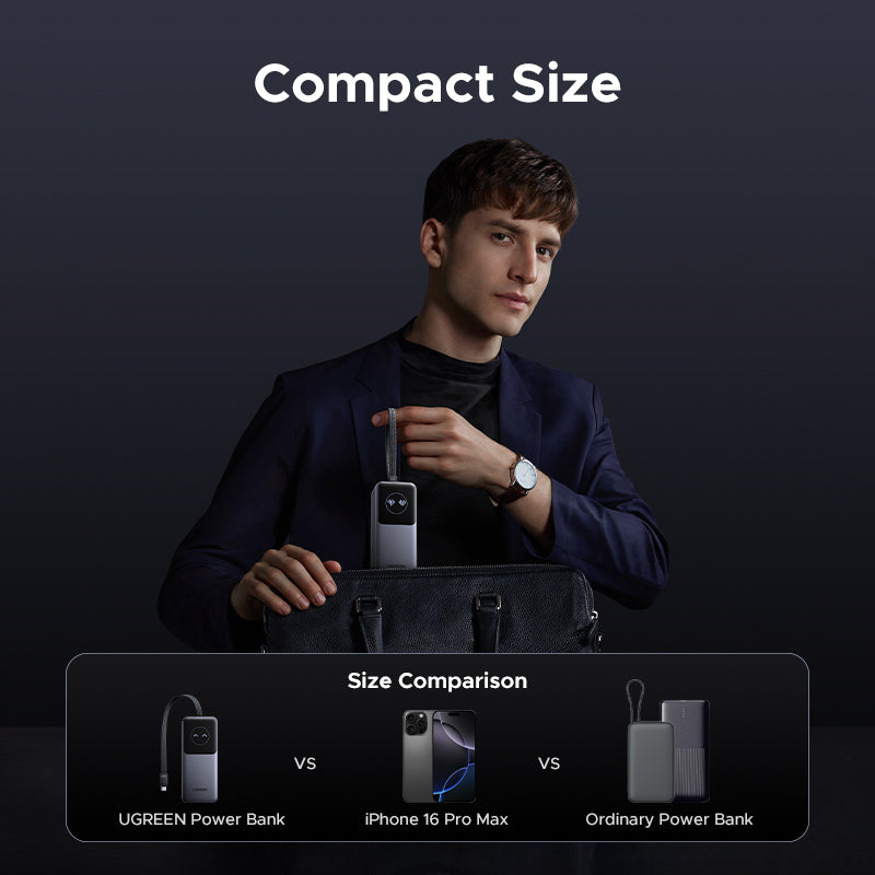 A compact 20,000 mAh power bank delivering up to 100W Power Delivery for a single device, with a built-in USB-C cable that doubles as a carry handle and supports simultaneous multi-device charging up to 130W. Featuring a smart display with real-time power data and animations, it’s designed for high-performance charging on the go.